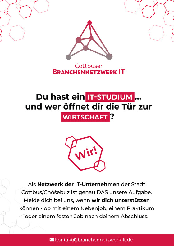 Auf unserer Website stellen wir die Vielfalt der regionalen IT-Landschaft vor und zeigen, welche beruflichen Perspektiven sie bietet. Mit dem Semesterstart am 01.10.2025 an der BTU Cottbus-Senftenberg tritt das Branchennetzwerk erstmals in die Öffentlichkeit und präsentiert sich mit Werbemitteln, Flyern & Plakaten an der Universität. Auch die Berufsschule in Forst wird über das Netzwerk informiert.